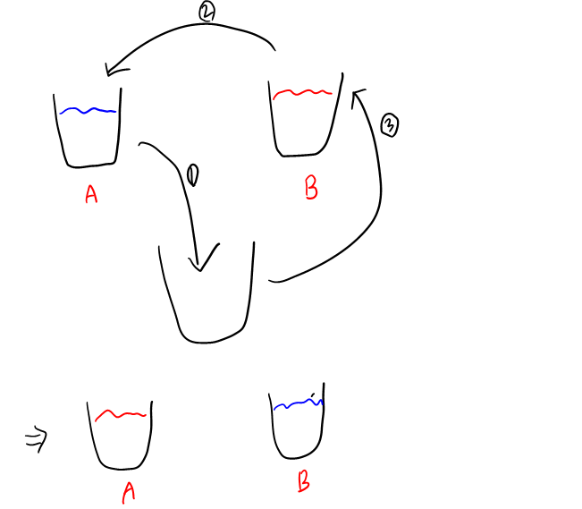 B컵에 담긴 물을 A컵에 넣고 , 그다음 새로운 컵에 넣은 우유를 B컵에 넣어주어야겠죠.