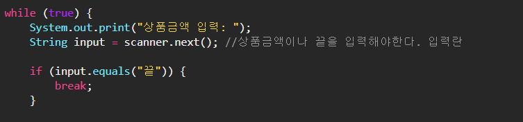 System.out.println("구매하신 상품들의 총 가격은 " + total + "입니다."); //끝을 입력하여 while문에서 빠져나오면